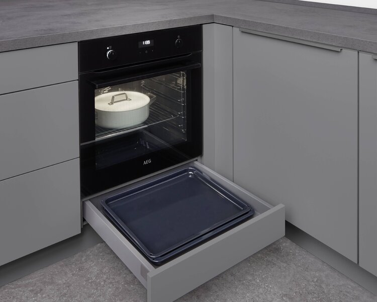 Ein Schubkasten unter dem Herd verstaut sperrige Backbleche perfekt. Zusätzlich bietet dieser Schubkasten Platz für andere wichtige Küchenutensilien, wie zum Beispiel Backformen oder Gitterroste.
