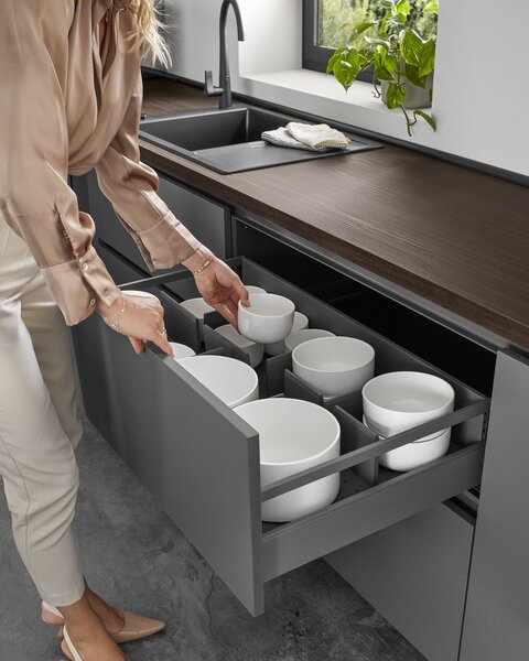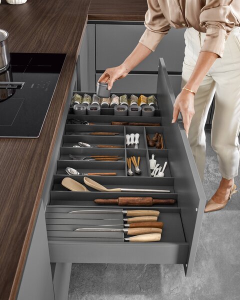 Besteckeinsätze und praktische Ordnungssysteme organisieren das Innenleben von Schränken und Auszügen. Auch Einsätze und Organisationssysteme für Schubladen spielen eine wichtige Rolle, um kleinere Teile wie Besteck, Gewürze, Messer und andere Küchenutensilien aufzubewahren. Du sparst Zeit und kannst direkt mit dem Kochen starten, ohne lange suchen zu müssen. Gut, wenn alles seinen festen Platz hat, zum Beispiel in einem Schubkasten unter dem Kochfeld.