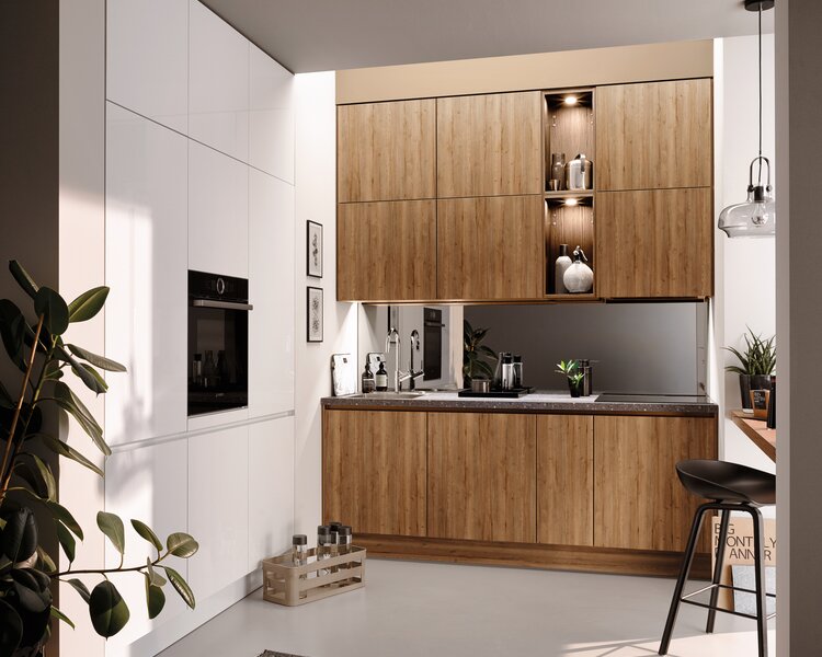 Lackierte und hochglänzende Fronten sind ein Geheimtipp für kleine Küchen. Sie reflektieren das Licht und erzeugen so eine Illusion von Tiefe und Weite. Diese reflektierenden Oberflächen verleihen der Küche nicht nur einen modernen Look, sondern lassen sie auch heller und offener erscheinen.