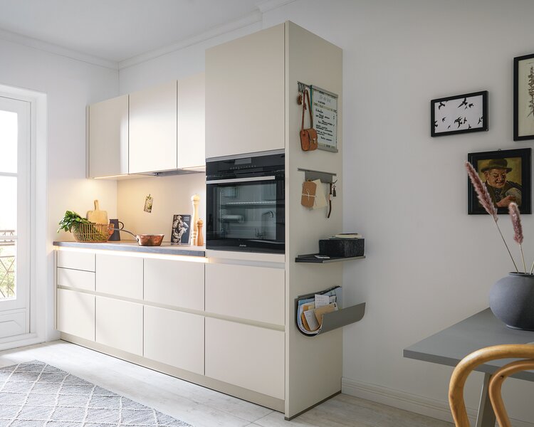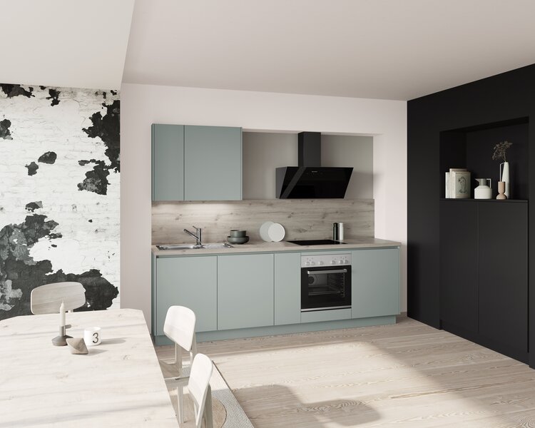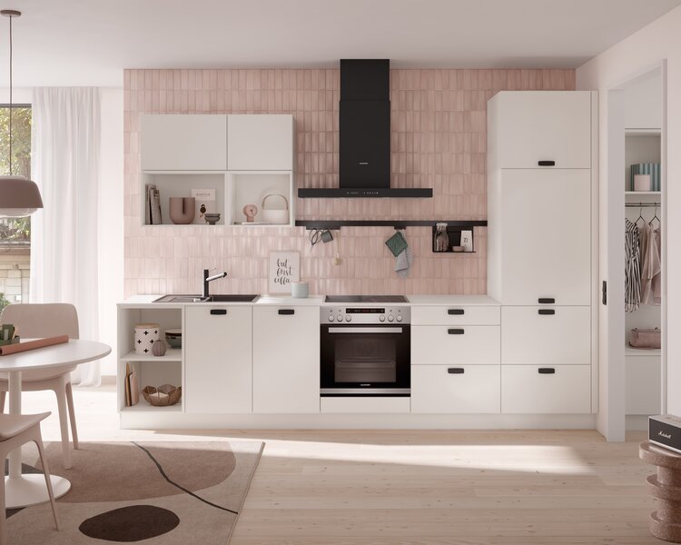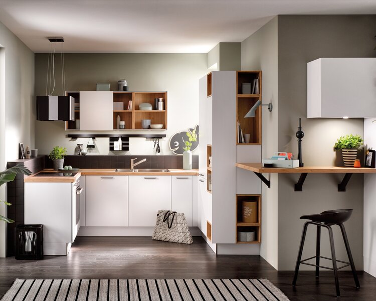 Offene Regale mögen reizvoll sein, können in kleinen Küchen jedoch schnell unruhig wirken. Entscheide Dich stattdessen für geschlossene Küchenschränke, um Stauraum zu schaffen und Unordnung aus dem Blickfeld zu halten. So wirkt der Raum aufgeräumter, und Du kannst hinter den Türen auch mal ein paar Dinge verstecken, die nicht perfekt organisiert sind. Mit unseren Planungstipps holst Du das Beste aus Deiner kleinen Küche heraus. Natürlich helfen wir Dir auch gerne bei der Küchenplanung und zeigen Dir erste Planungsideen für kleine Küchen:
