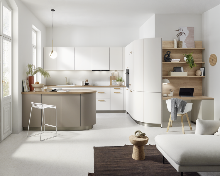 Harte Kanten weichen sanften Rundungen: Geschwungene Linien und organische Designs bringen eine neue Leichtigkeit in die Küchenwelt. Abgerundete Fronten und geschmeidige Übergänge zwischen Koch- und Wohnbereich sorgen für ein angenehmes Raumgefühl und laden zum Verweilen ein. Runde Schrankelemente, geschwungene Arbeitsplatten und nahtlose Übergänge zwischen Ess- und Kochbereich bilden eine harmonische Einheit. Besonders beliebt sind Möbel mit weichen Konturen, die nicht nur optisch ansprechend, sondern auch praktisch sind.