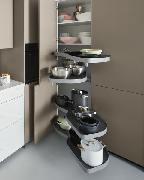 Hoch- und Vorratsschränke nutzen den vertikalen Raum und bieten Platz für alles, was im Alltag gebraucht wird – von Konserven bis zum Putz-Equipment. Tablare in Oberschränken ergänzen das Stauraumkonzept und sorgen für zusätzliche Ordnung. Wer keine Abstellkammer hat, findet in Hochschränken mit individuell konfigurierbaren Ordnungssystemen eine elegante Lösung.